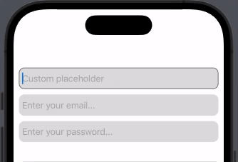 finalclassCustomTextField:UIView{// MARK: - Components// we may refer to this class, outside of the CustomTextField classlazyvartextField:UITextField={lettextField=UITextField(frame:.zero)textField.textColor=.labeltextField.translatesAutoresizingMaskIntoConstraints=falsereturntextField}()privatelazyvartextFieldBackgroundView:UIView={letview=UIView(frame:.zero)view.backgroundColor=.black.withAlphaComponent(0.125)view.layer.cornerRadius=10view.layer.masksToBounds=trueview.translatesAutoresizingMaskIntoConstraints=falsereturnview}()// MARK: - LifeCycleoverrideinit(frame:CGRect=.zero){super.init(frame:frame)setup()}requiredinit?(coder:NSCoder){fatalError("init(coder:) has not been implemented")}// MARK: - setupprivatefuncsetup(){addSubview(textFieldBackgroundView)textFieldBackgroundView.addSubview(textField)// use the intrinsic height of the UITextField to configure top and bottom for the text fieldBackgroundViewtextFieldBackgroundView.leftAnchor.constraint(equalTo:leftAnchor).isActive=truetextFieldBackgroundView.rightAnchor.constraint(equalTo:rightAnchor).isActive=truetextFieldBackgroundView.topAnchor.constraint(equalTo:textField.topAnchor,constant:-9).isActive=truetextFieldBackgroundView.bottomAnchor.constraint(equalTo:textField.bottomAnchor,constant:9).isActive=truetextField.leftAnchor.constraint(equalTo:textFieldBackgroundView.leftAnchor,constant:6).isActive=truetextField.rightAnchor.constraint(equalTo:textFieldBackgroundView.rightAnchor,constant:-6).isActive=truetranslatesAutoresizingMaskIntoConstraints=falseheightAnchor.constraint(equalTo:textFieldBackgroundView.heightAnchor).isActive=true}}
